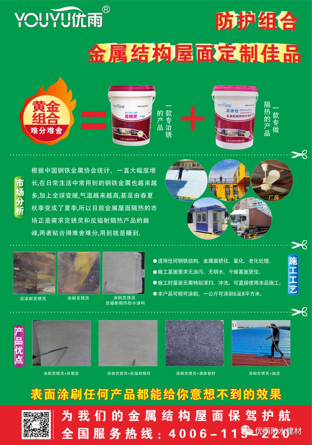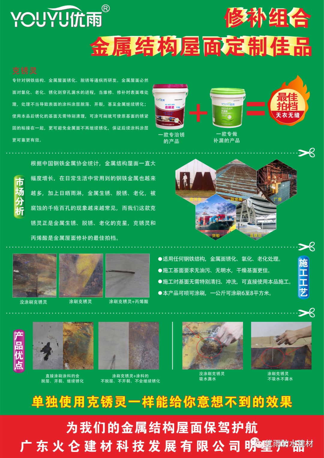 克銹靈是我公司特別研發(fā)的一款專治銹的產(chǎn)品,它是一款高滲透性、水溶性液體。專針對鋼鐵結(jié)構(gòu)、金屬屋面銹化、脫銹等通病而研發(fā)。金屬屋面必然面對氧化、老化、銹化到穿孔漏水的進程,當(dāng)維修、修補時表面難處理,處理不當(dāng)導(dǎo)致表面的涂料涂層脫落、開裂,甚至金屬繼續(xù)銹化;使用本品后銹化的基面無需特別清理,可涂可刷就可使原基面的銹緊固的粘接在一起,更可避免金屬面不再繼續(xù)銹化,保證后續(xù)涂料涂層更可靠更有效。