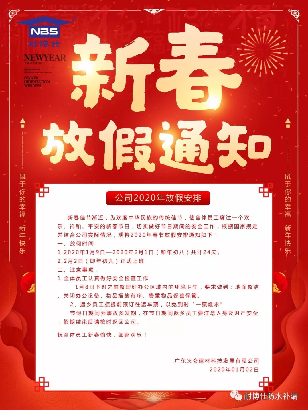 新春佳節(jié)漸近,為歡度中華民族的傳統(tǒng)佳節(jié),使全體員工度過(guò)一個(gè)歡樂(lè)、祥和、平安的新春節(jié)日,切實(shí)做好節(jié)日期間的安全工作,根據(jù)國(guó)家規(guī)定并結(jié)合公司實(shí)際情況,現(xiàn)將2020年春節(jié)放假安排通知如下: