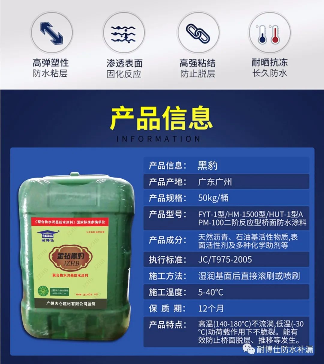 本產(chǎn)品是以特定的高性能建筑乳液為載體,經(jīng)各種助劑改性之后形成的高聚物防水乳液。本產(chǎn)品具有優(yōu)良的粘結(jié)性、抗?jié)B性、抗裂性、耐久性和耐酸堿性等功效。該產(chǎn)品無毒、無污染、施工方便,具有顯著的環(huán)境效益,是新一代環(huán)保型防水材料。