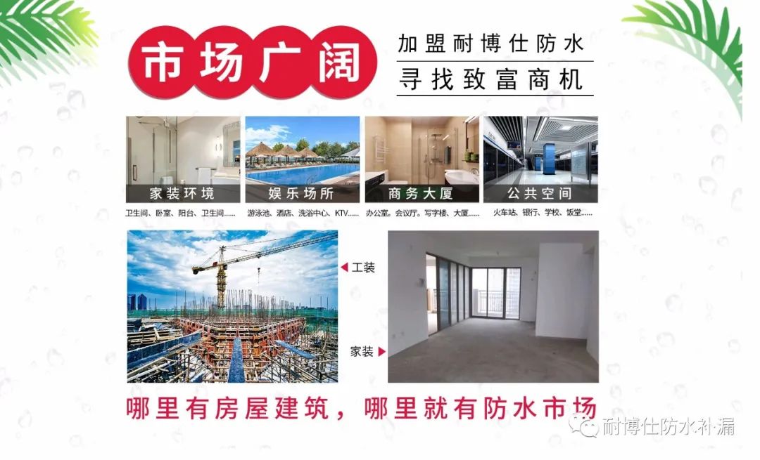 1、廣泛用于外墻、廁浴廚間、游泳池、地下室、屋面及其它建筑物的防水、防滲漏、防潮等工程。