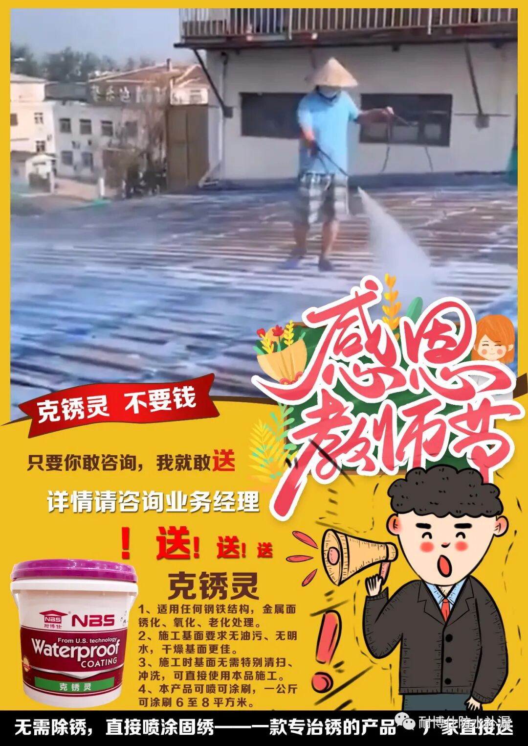 為了感恩回饋老客戶,現(xiàn)在公司決定拿出克銹靈免費(fèi)送,只要你敢來(lái),我們就敢送,耐博仕克銹靈是一款專治銹的產(chǎn)品,無(wú)需除銹,直接固繡,打破傳統(tǒng)除銹,新型固繡材料現(xiàn)在免費(fèi)送。